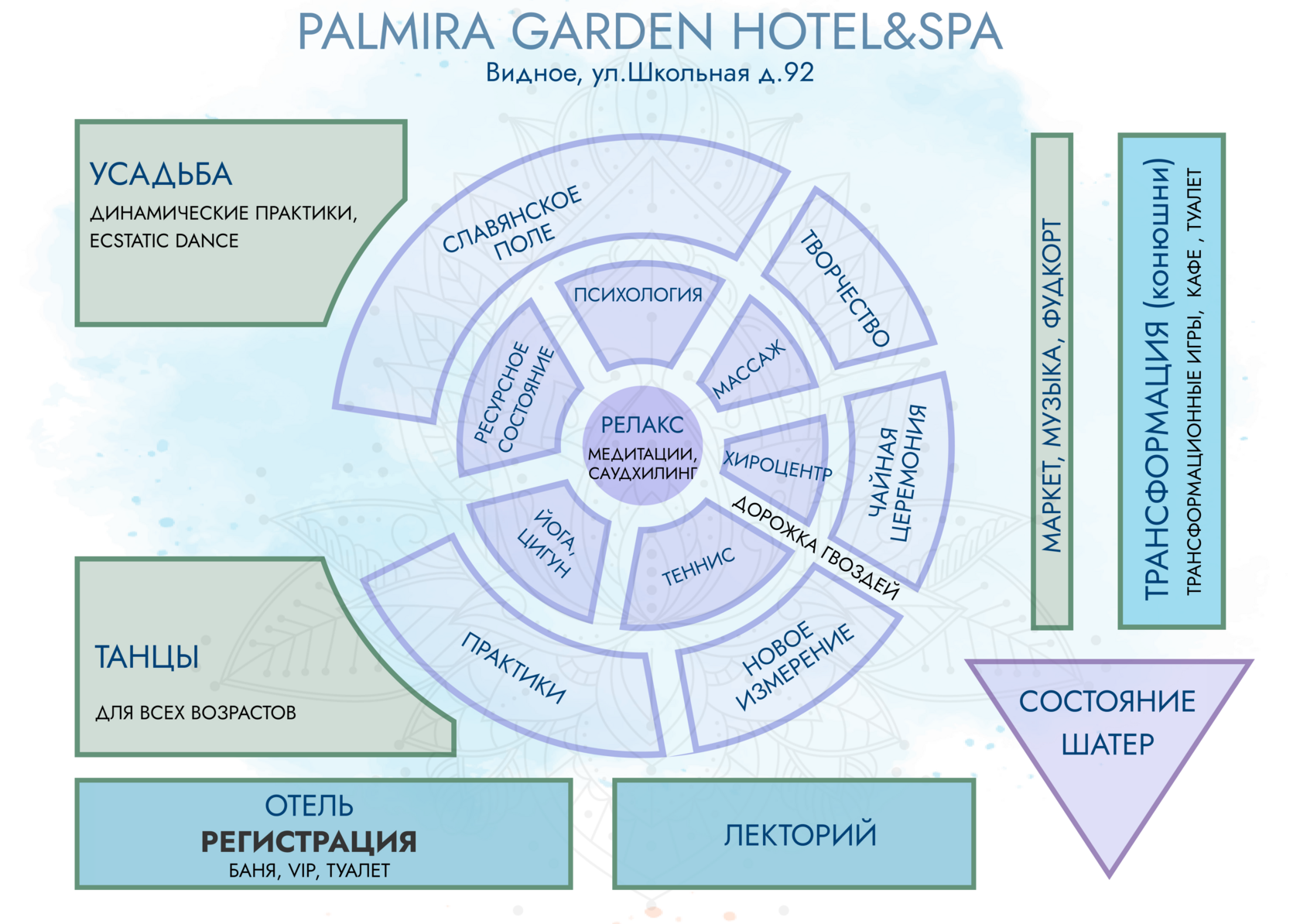 В программе: Танцы для взрослых и детей, Концерт, Живая музыка, Ecstatic Dance, Йога, Медитации, Cемейные игры, Поющие чаши, Цигун, Массаж, Zumba, Гонг, Трансформационные игры, Чайная церемония, ТОПовые спикеры, Творческие мастер-классы, Bachata, Fair show, Маркет и Фудуорт.